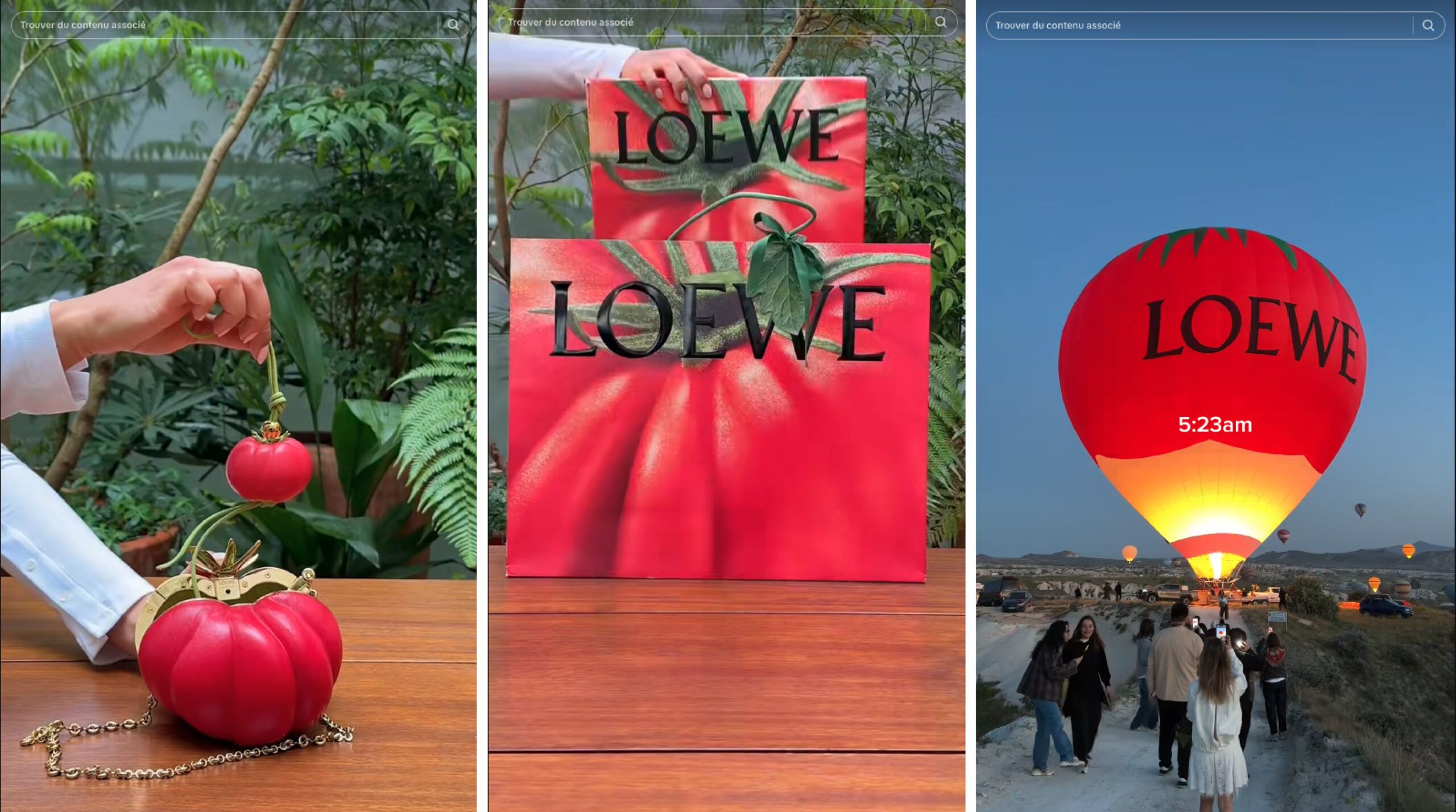 Et ce n’est qu’un exemple parmi tant d’autres : ouvrez l’œil et vous verrez que les collaborations mode X gastronomie fleurissent dans vos feed. Par exemple, LOEWE semble dernièrement s’associer au symbole de la tomate. Montgolfière, packaging, sac… la tomate est partout et elle est loin d’être le seul végétal à envahir la marque : on aperçoit aussi sur leurs réseaux sociaux pommes et citrouilles.